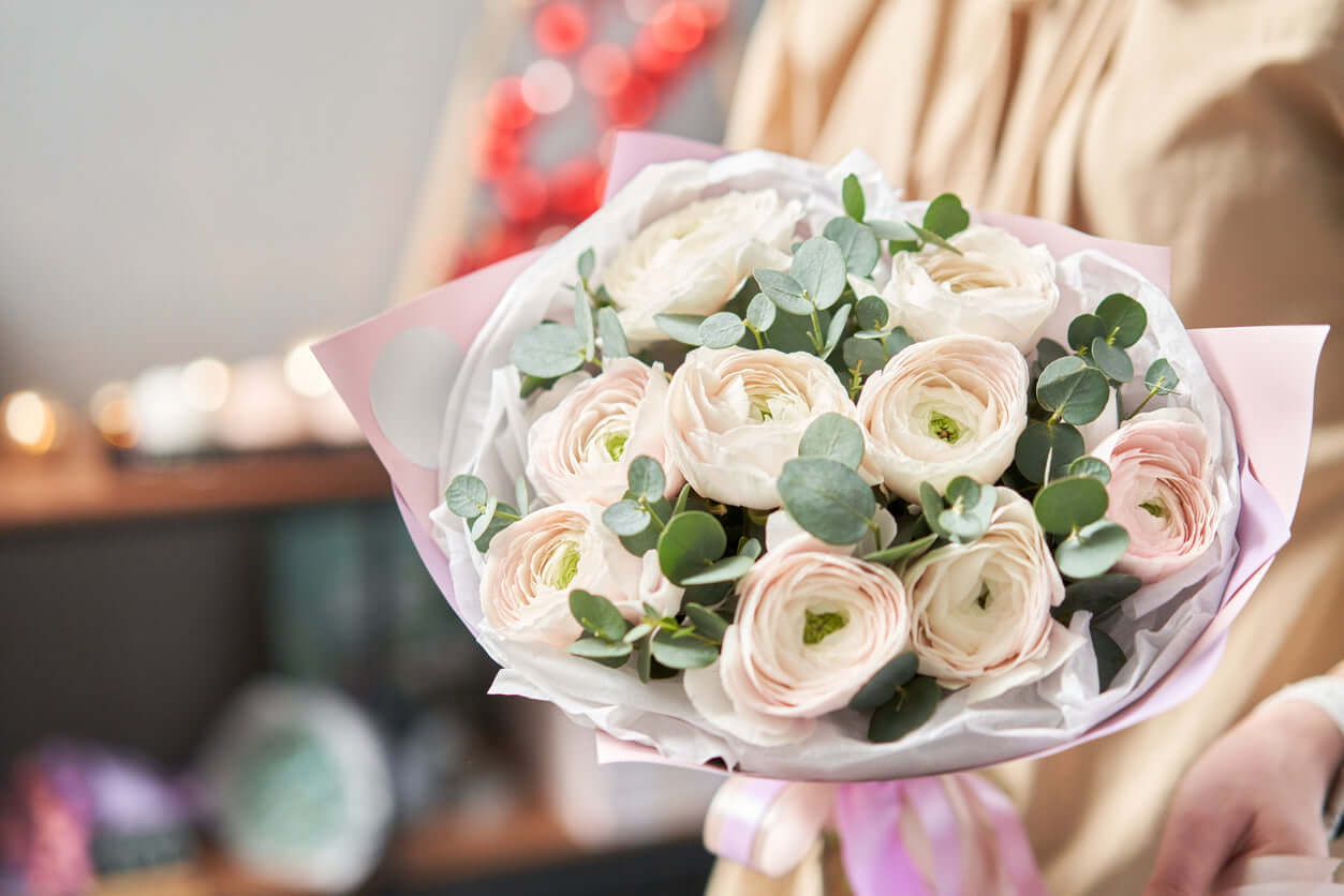 Dieser Strauß ist eine perfekte Kombination aus Ranunkeln & Eukalyptus.